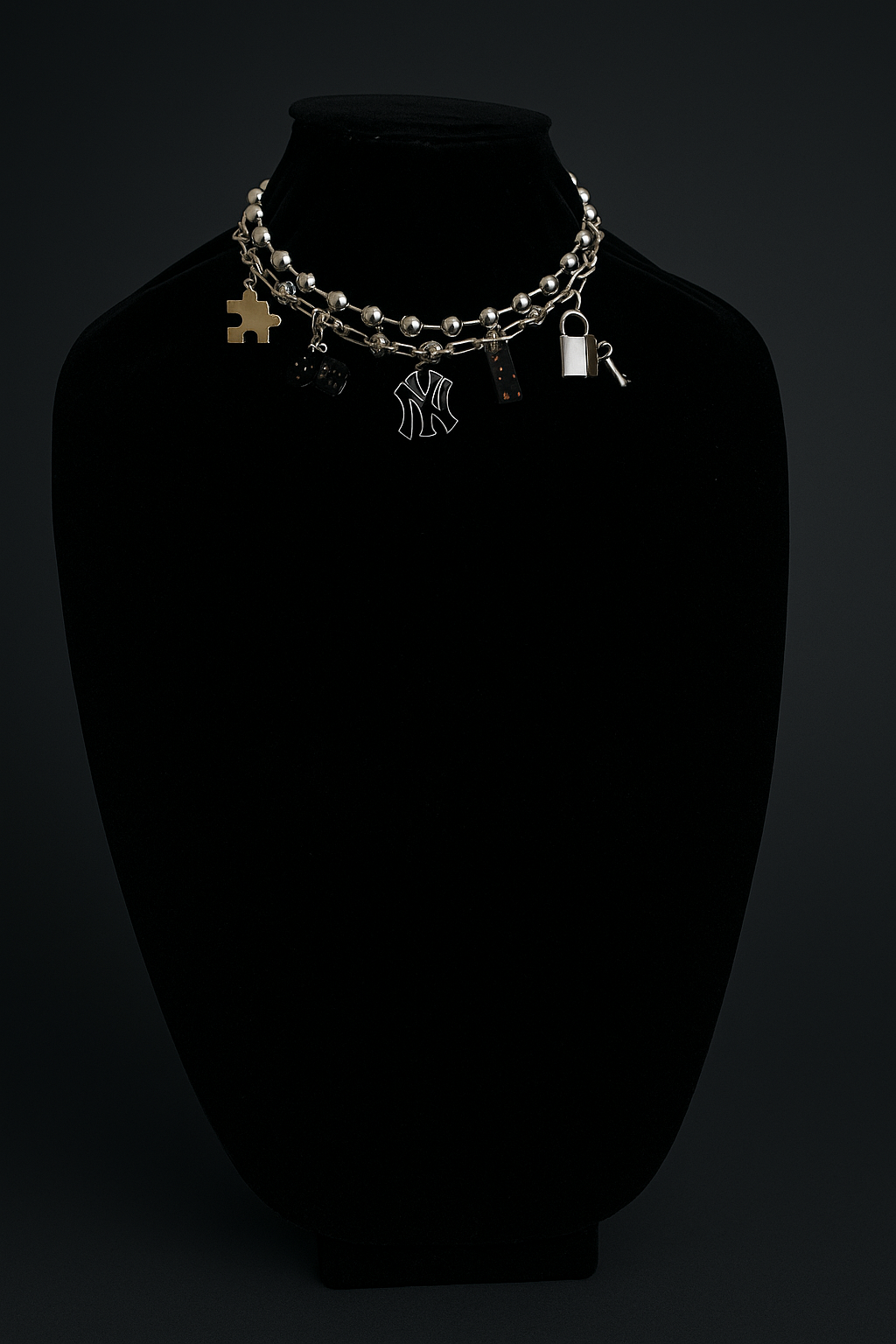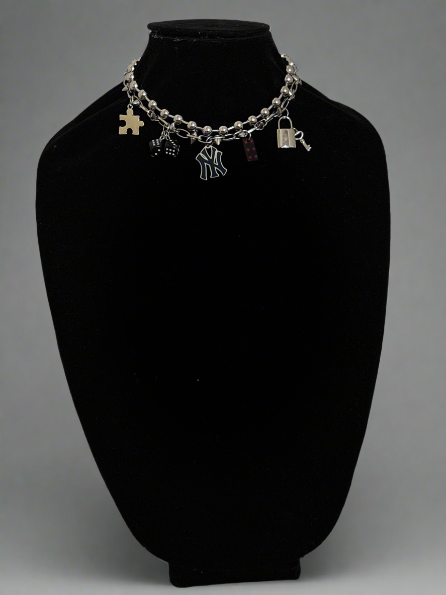 Playful silver tone necklace features 14inch dual chain layers accented with standout charms: a puzzle piece, dice, domino, padlock with key, and the iconic NY pendant. A streetwear inspired piece that adds personality and edge to any outfit.